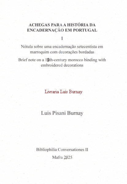 ACHEGAS PARA A HISTÓRIA DA ENCADERNAÇÃO EM PORTUGAL 1 - NÓTULA SOBRE UMA ENCADERNAÇÃO SETECENTISTA EM MARROQUIM COM DECORAÇÕES BORDADAS = BRIEF NOTE ON A 18TH-CENTURY MOROCCO BINDING WITH EMBROIDERED DECORATIONS P.f. preencha e envie o formulário - quando esta obra estiver disponível receberá um e-mail automático a dar-lhe conta |