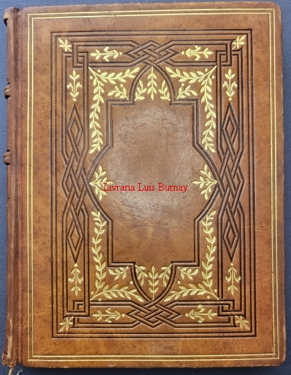 Bonito missal, revestido por uma luxuosa encadernação inteira de pele, com elaboradas composições em ferros a ouro e a seco nas pastas. Guardas em cetim e ferros nas seixas.